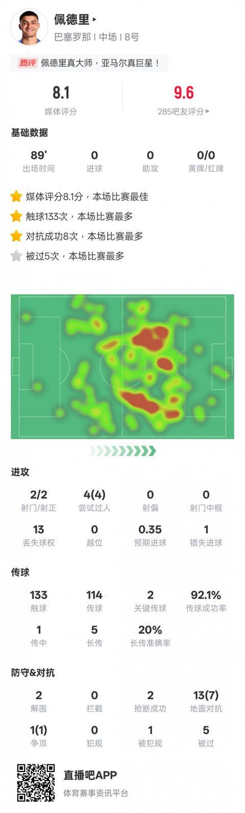 本场比赛,佩德里送出2次关键传球,4次过人均成功,传球成功率92.1%,133次触球也是全场最多,还有2次解围和2次抢断。