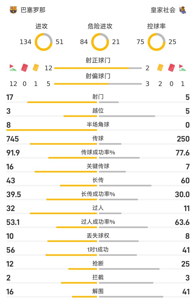 巴萨vs皇家社会全场数据:射正12-2,控球率高达75%