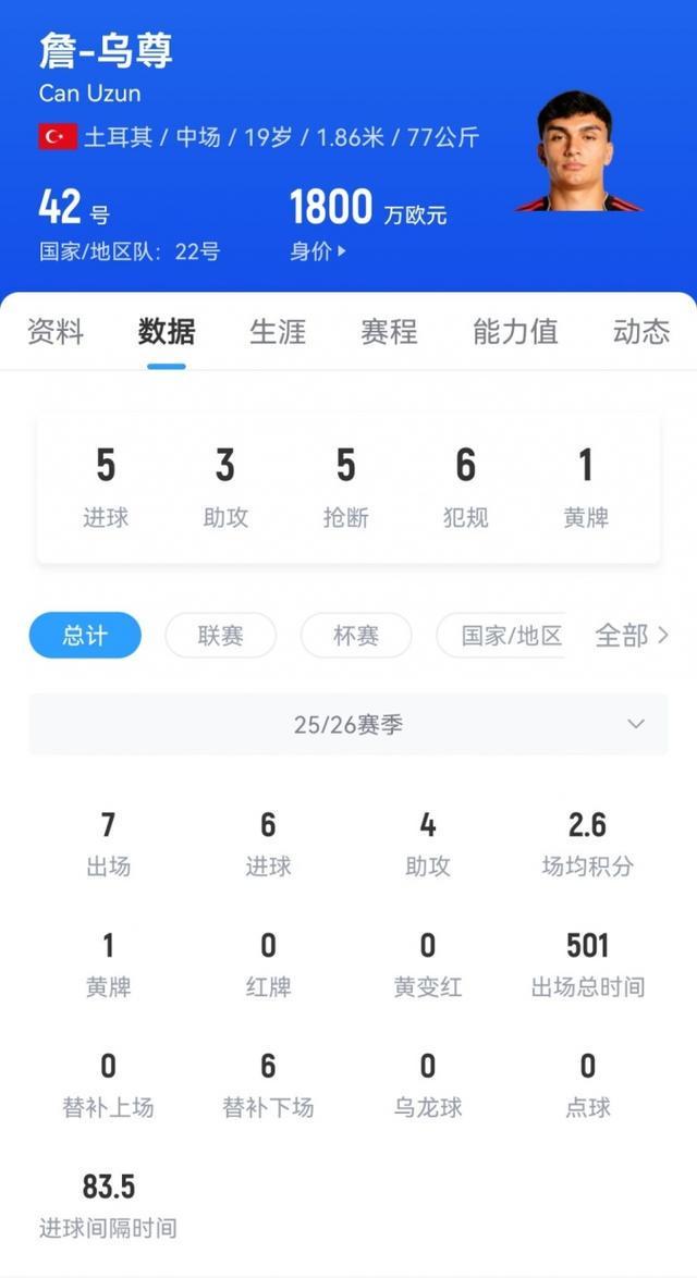 法鹰上新货19岁中场乌尊德甲5轮5球3助 身价1800万去年被疯抢
