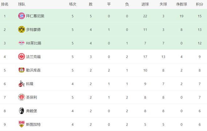 在积分榜上,5连胜的拜仁依然占据榜首位置,拿到了15分。多特蒙德4胜1平,拿到13分,紧追拜仁。前2的差距只有2分,看来本赛季对拜仁来说最强大的竞争对手是多特蒙德,而不是勒沃库森。莱比锡则以12分排名第3。法兰克福赢球之后,总积分达到9分,排名第4。勒沃库森2胜2平1负,拿到8分,排名第5。科隆和圣保利都拿到7个积分,排名第6和第7名。