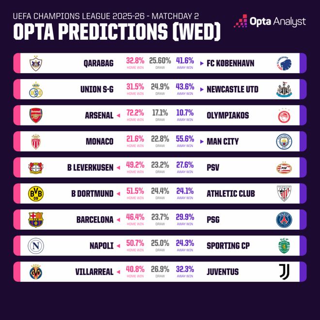 周四的欧冠赛事将以两场超级计算机预测客胜的比赛拉开帷幕。