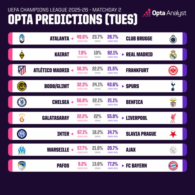 然而,超级计算机更看好周二另一场早场比赛的主队——亚特兰大在对阵布鲁日的模拟中胜率为49.6%。