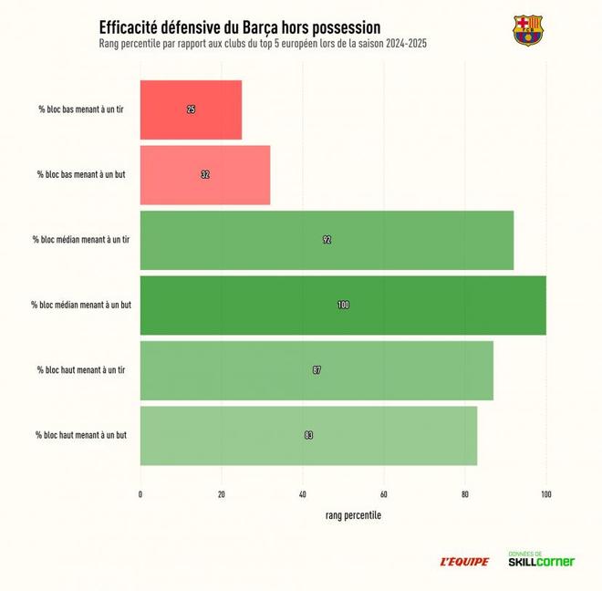 矛盾的是,巴塞罗那在低位防守时最为脆弱。但这也是他们最不常遇到的情况。这一点依然引人深思,因为其他高位防守的球队在被迫退守本方禁区前防守时表现更好,例如拜仁和巴黎圣日耳曼。