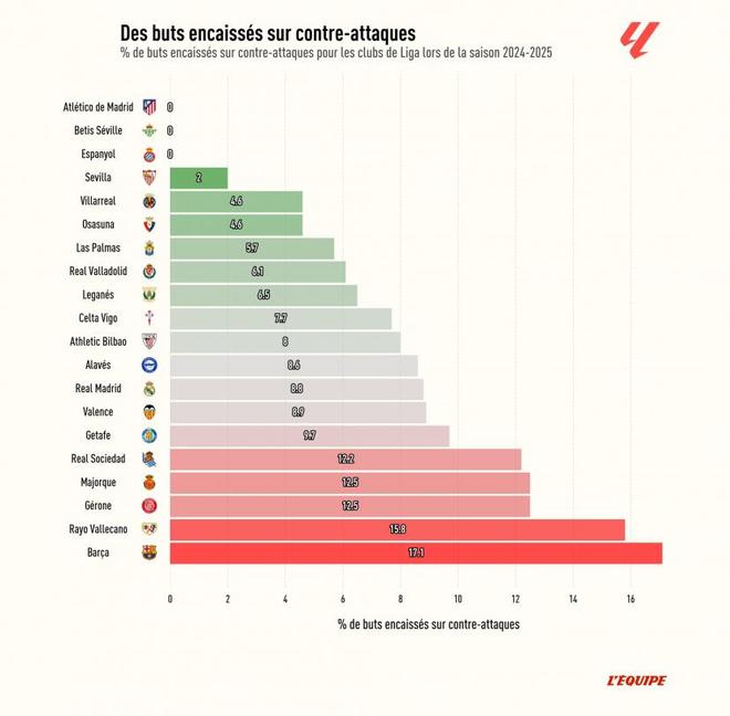 让我们聚焦上赛季的数据,毕竟本赛季的样本量仍然不足。根据Opta的数据,巴塞罗那是上赛季西甲因反击丢球占比最高的西班牙俱乐部(17.1%)。更广泛地说,四分之一的被射门机会来自这些情况。