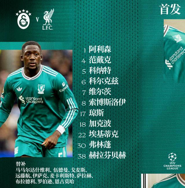 主教练斯洛特此战派上埃基蒂克单箭头,身后是加克波、维尔茨和弗林篷,柯蒂斯-琼斯和赫拉芬贝赫坐镇中场。
