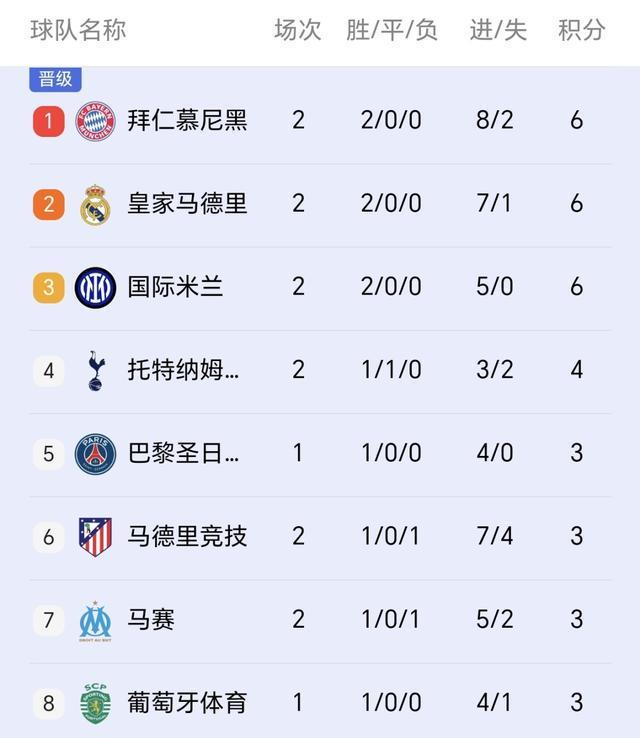拜仁积6分以净胜球优势高居积分榜第一,同分的皇马和国米紧随其后,紧跟着积4分的热刺,积3分的巴黎、马竞和马赛等队,本菲卡积0分位列第30,同样0分的阿拉木图凯拉特第36垫底!