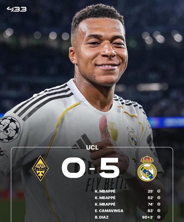 凭借姆巴佩的帽子戏法、卡马文加和迪亚斯的进球,皇马客场轻松取得5-0大胜!