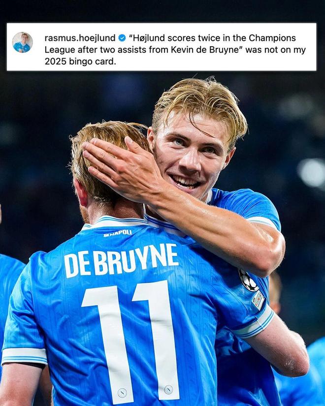 本场比赛,霍伊伦完成2次射正,6次争顶4次成功,均为全场最多。最终经过评选,霍伊伦当选欧冠官方全场最佳球员,并在赛后领取了奖杯。赛后,霍伊伦更新社交媒体,写道:“‘霍伊伦在欧冠中梅开二度,两次助攻都来自德布劳内’,这完全不在我2025年的预期清单里。”