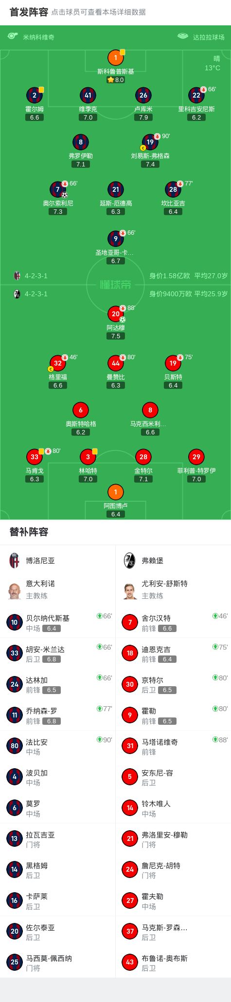 博洛尼亚1-1弗赖堡,奥尔索利尼破僵,阿达穆点射扳平